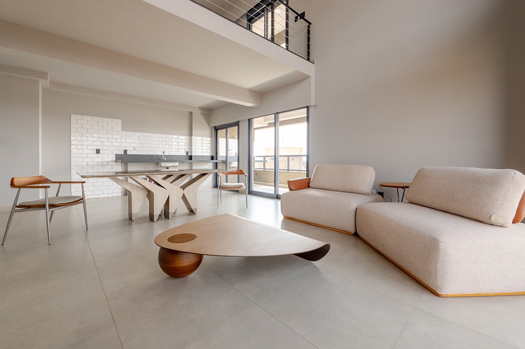 Móveis assinados trazem diferenciação. Mesmo quando produzidos em escala, mantêm um caráter único, tornando o loft visualmente marcante e personalizado.